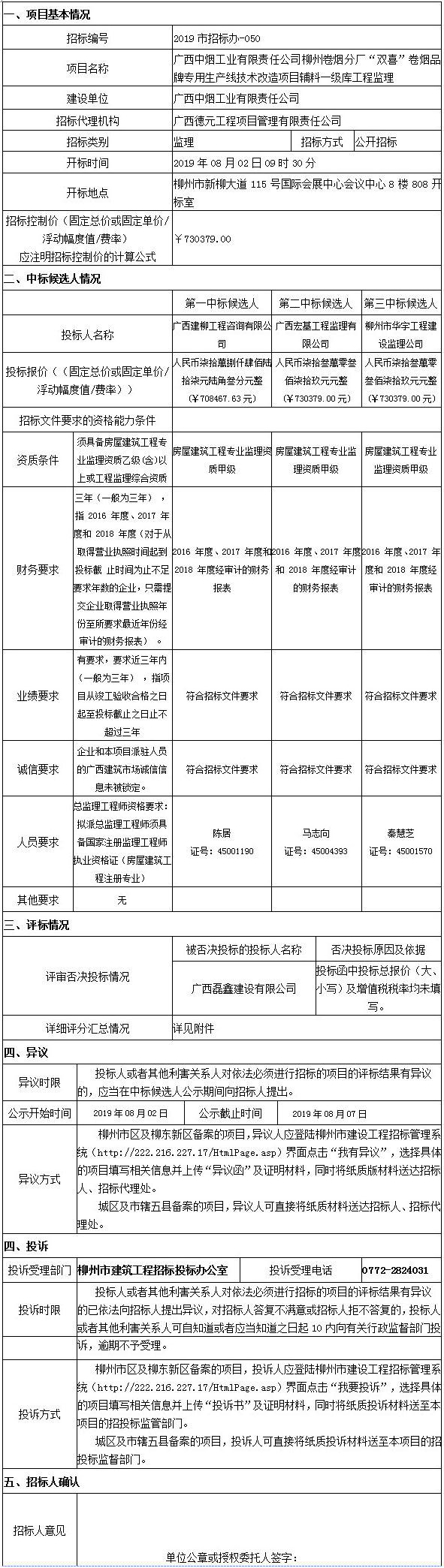 中标候选人公示(柳州卷烟分厂“双喜”卷烟品牌专用生产线技术改造项目辅料一级库工程监理)