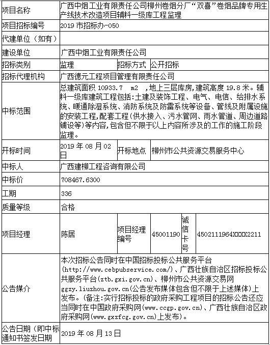 广西中烟工业有限责任公司柳州卷烟分厂“双喜”卷烟品牌专用生产线技术改造项目辅料一级库工程监理中标公告