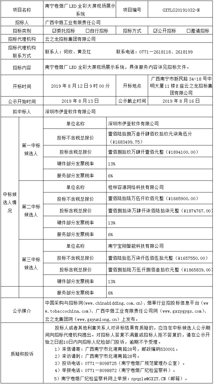 中标候选人公示(南宁卷烟厂LED全彩大屏现场展示系统GXYLG20191032-N)