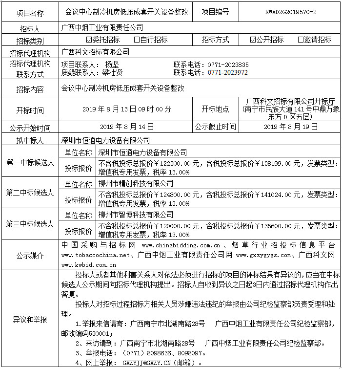 会议中心制冷机房低压成套开关设备整改(KWAD2G2019570-2) 中标候选人公示