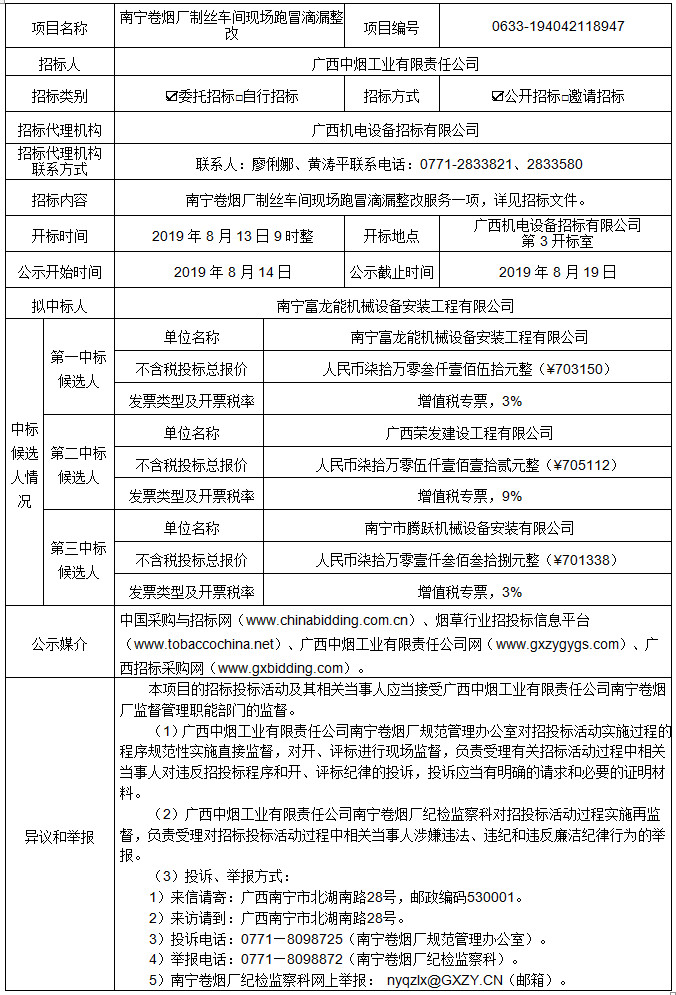 南宁卷烟厂制丝车间现场跑冒滴漏整改(项目编号:0633-194042118947)中标候选人公示