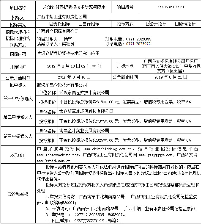 中标候选人公示(片烟仓储养护调控技术研究与应用(KWAD5G2019931))