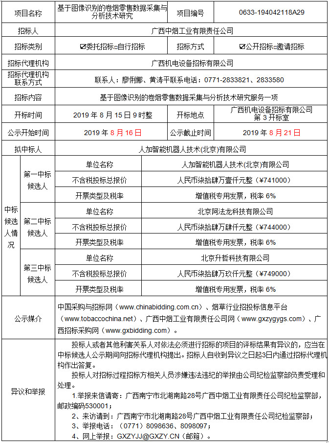 中标候选人公示(基于图像识别的卷烟零售数据采集与分析技术研究(项目编号:0633-194042118A29))