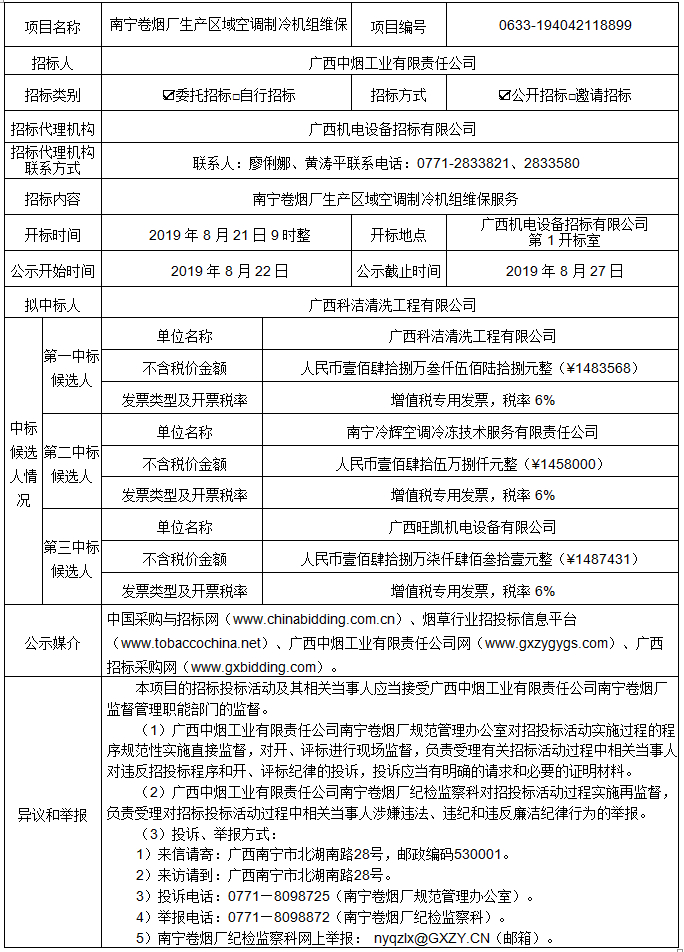 南宁卷烟厂生产区域空调制冷机组维保(项目编号:0633-194042118899)中标候选人公示