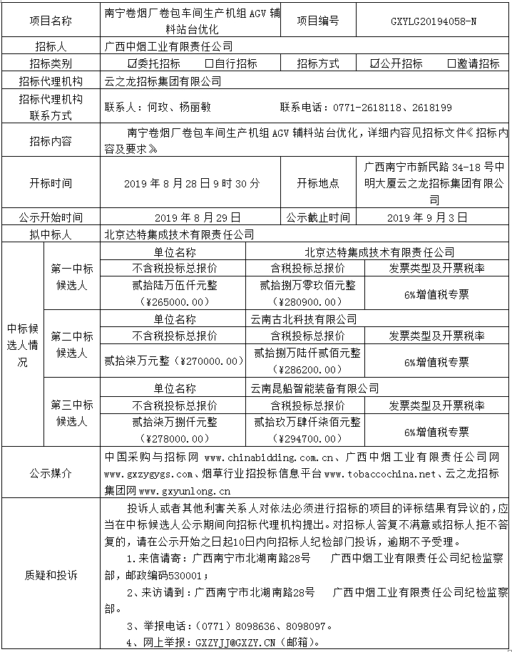 中标候选人公示(项目名称: 南宁卷烟厂卷包车间生产机组AGV辅料站台优化)