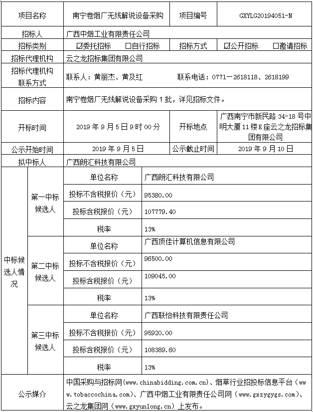 中标候选人公示(南宁卷烟厂无线解说设备采购GXYLG20194051-N)