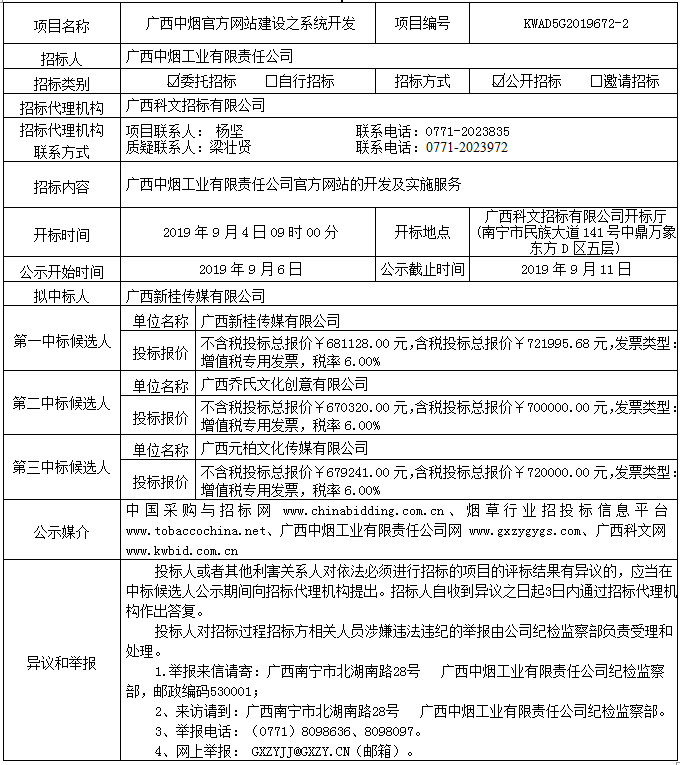 广西中烟官方网站建设之系统开发(KWAD5G2019672-2)中标候选人公示