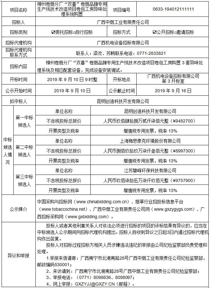 中标候选人公示(柳州卷烟分厂“双喜”卷烟品牌专用生产线技术改造项目卷包工房异味处理系统购置(项目编号:0633-194012111111))