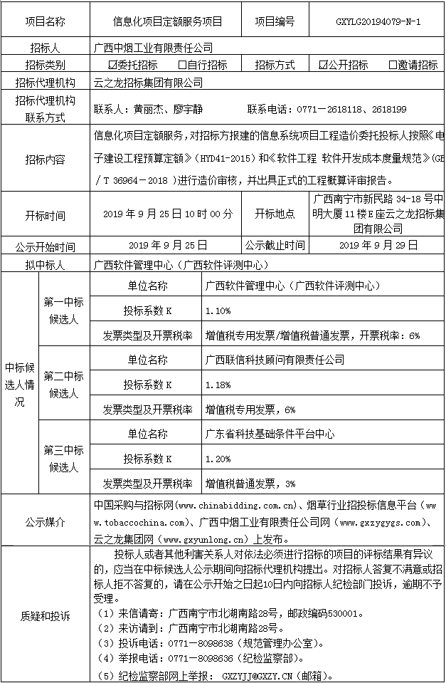 中标候选人公示(信息化项目定额服务项目GXYLG20194079-N-1)