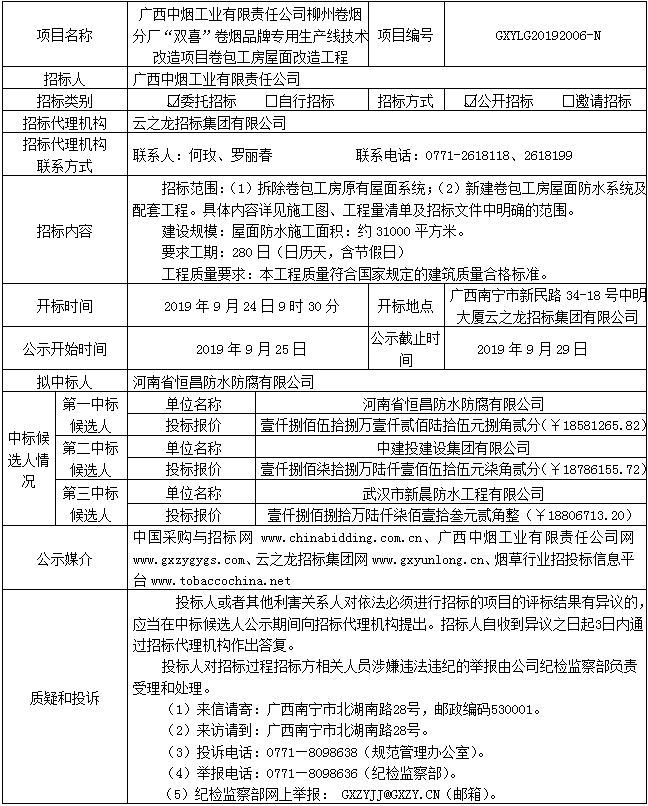 中标候选人公示(柳州卷烟分厂“双喜”卷烟品牌专用生产线技术改造项目卷包工房屋面改造工程)