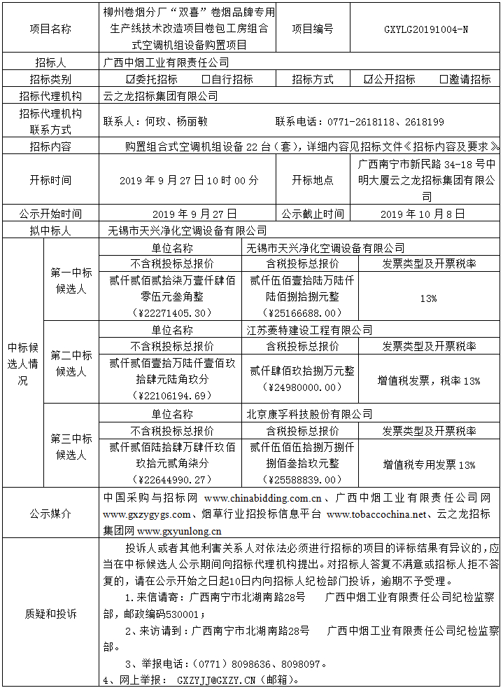 中标候选人公示(柳州卷烟分厂“双喜”卷烟品牌专用生产线技术改造项目卷包工房组合式空调机组设备购置项目)