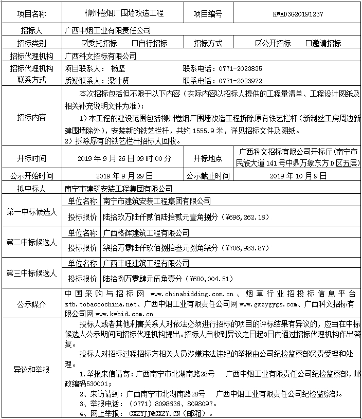 中标候选人公示(柳州卷烟厂围墙改造工程(KWAD3G20191237))