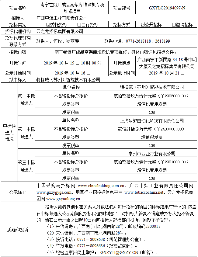 中标候选人公示(南宁卷烟厂成品高架库堆垛机专项维修项目采购)