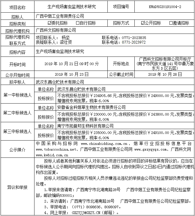 生产现场害虫监测技术研究(KWAD5G20191004-2)中标候选人公示