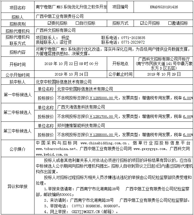 南宁卷烟厂MES系统优化升级之软件开发(KWAD5G20191426)中标候选人公示