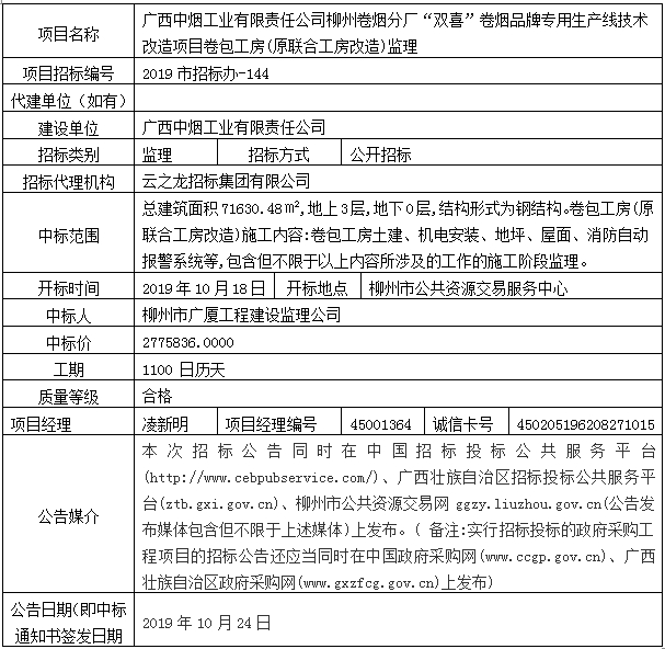 广西中烟工业有限责任公司柳州卷烟分厂“双喜”卷烟品牌专用生产线技术改造项目卷包工房(原联合工房改造)监理中标公告