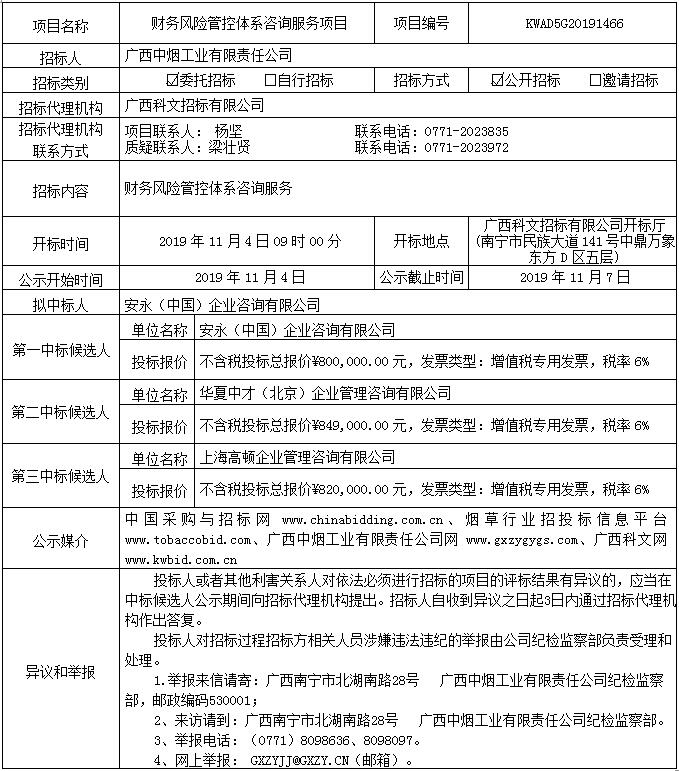 中标候选人公示(财务风险管控体系咨询服务项目(KWAD5G20191466))