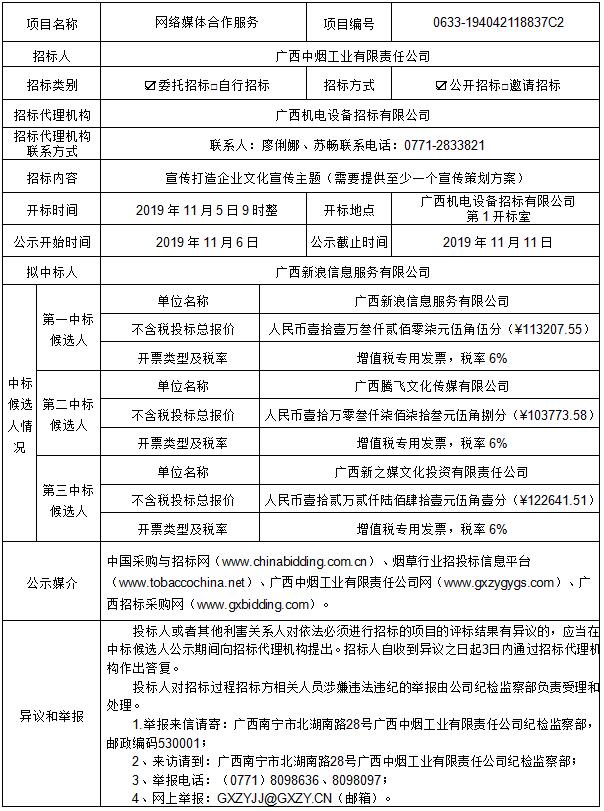 网络媒体合作服务(项目编号:0633-194042118837C2)中标候选人公示
