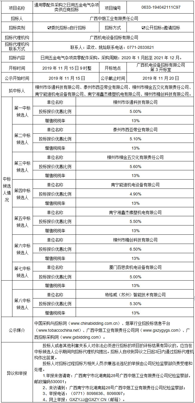 通用零配件采购之日用五金电气杂项类供应商招标(项目编号:0633-194042111C97)中标候选人公示