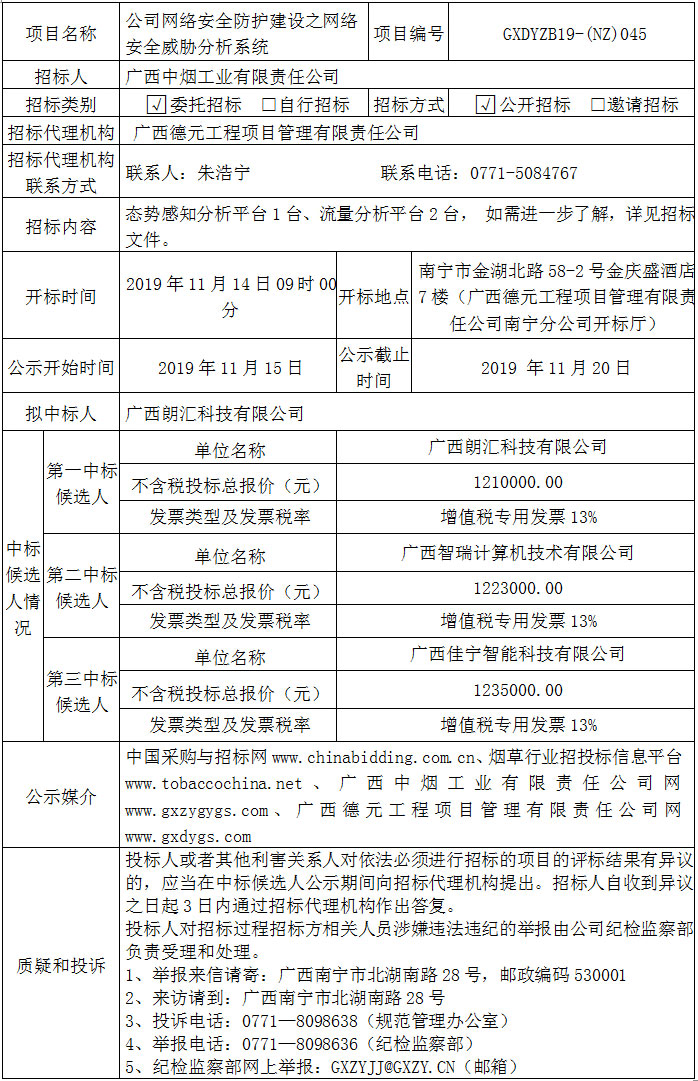 中标候选人公示(公司网络安全防护建设之网络安全威胁分析系统)
