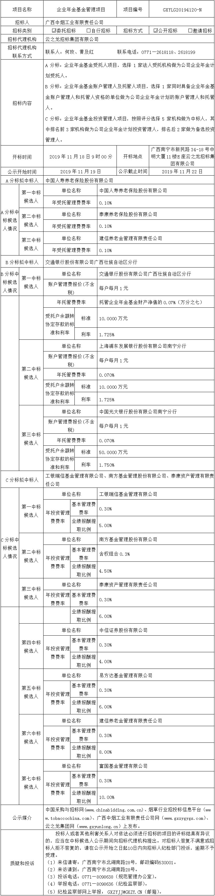 中标候选人公示(企业年金基金管理项目GXYLG20194120-N)