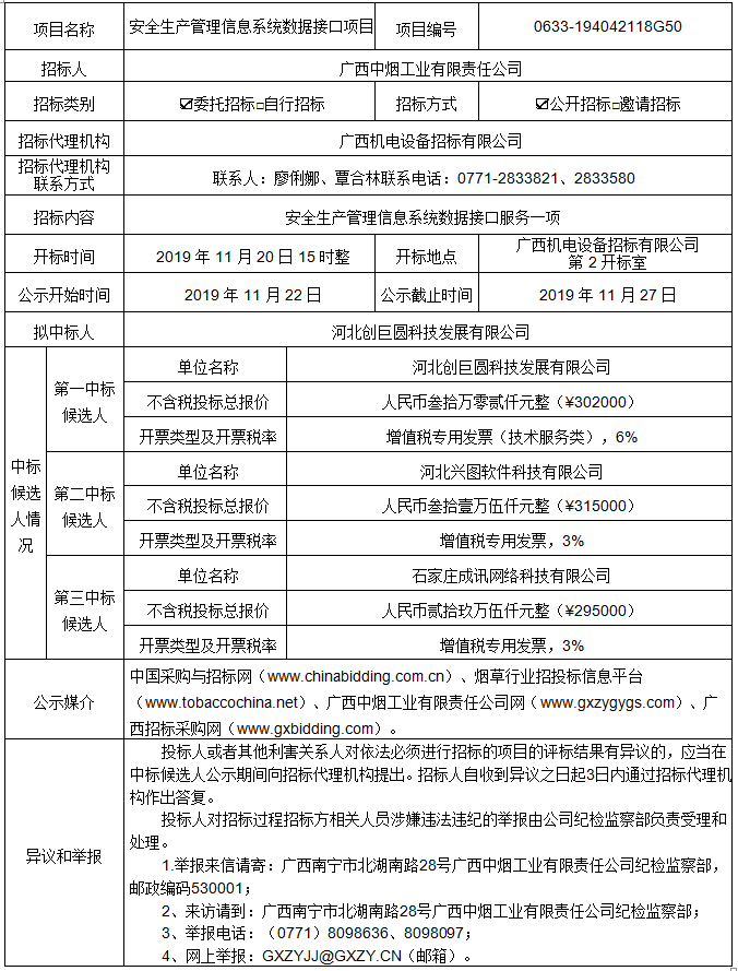 安全生产管理信息系统数据接口项目(项目编号:0633-194042118G50)中标候选人公示