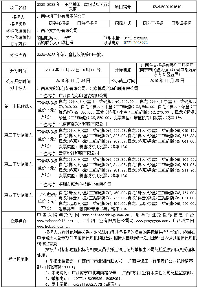 中标候选人公示(2020-2022年自主品牌条、盒包装纸(五)采购(KWAD5G20191610))