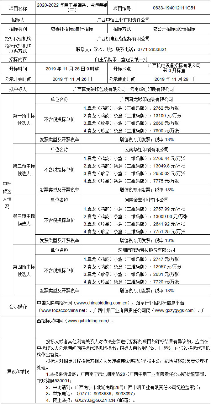 中标候选人公示(2020-2022年自主品牌条、盒包装纸(三)编号:0633-194012111G51)