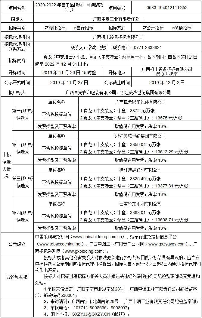 中标候选人公示(2020-2022年自主品牌条、盒包装纸(六) 编号:0633-194012111G52)