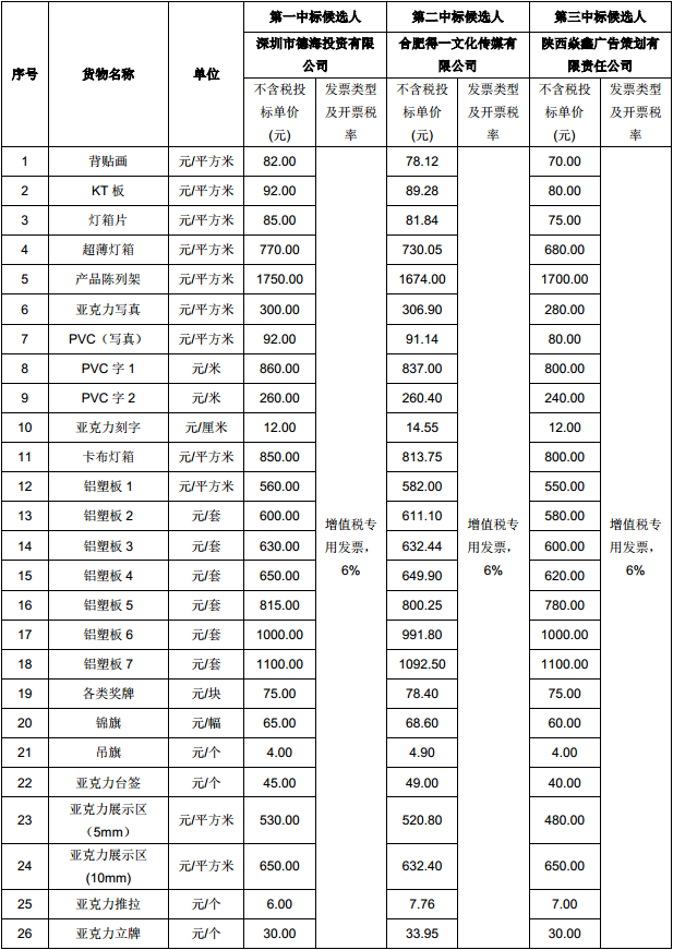中标候选人不含税单价附件: