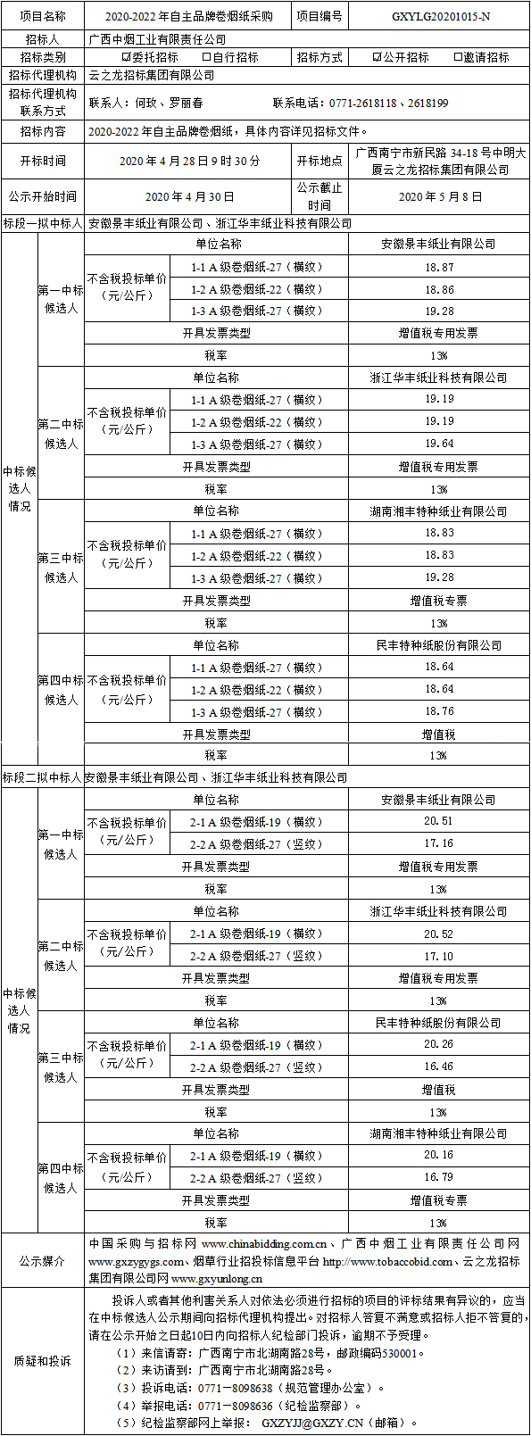 中标候选人公示(项目名称:2020-2022年自主品牌卷烟纸采购)