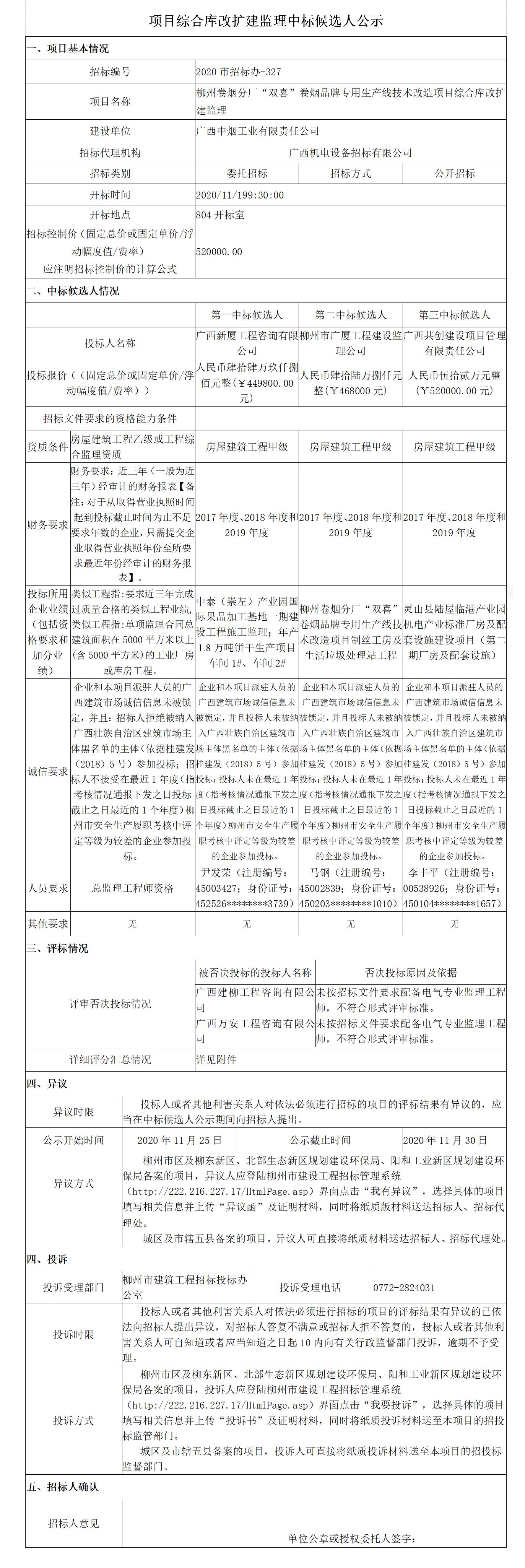 广西中烟工业有限责任公司柳州卷烟分厂“双喜”卷烟品牌专用生产线技术改造项目综合库改扩建监理中标候选人公示
